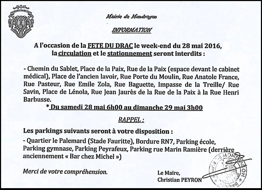 Les fêtes médiévales sont plus ou moins tenaces. Celle de Mondragon, la bien nommée Fête du Drac, arbore cette année son 45ème pavillon. Chaque printemps, le Comité des fêtes du village réactive donc la légende du Rhône en réveillant le dragon qui surgit du fleuve pour semer la terreur. En fait, voilà qui se traduit par toutes sortes de réjouissances à caractère moyenâgeux. La foule afflue, venant des larges environs. C’est l’occasion d’échapper momentanément aux tourments d’une actualité pesante.