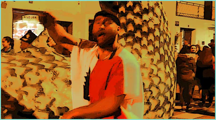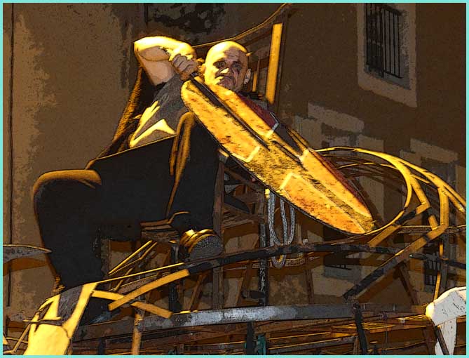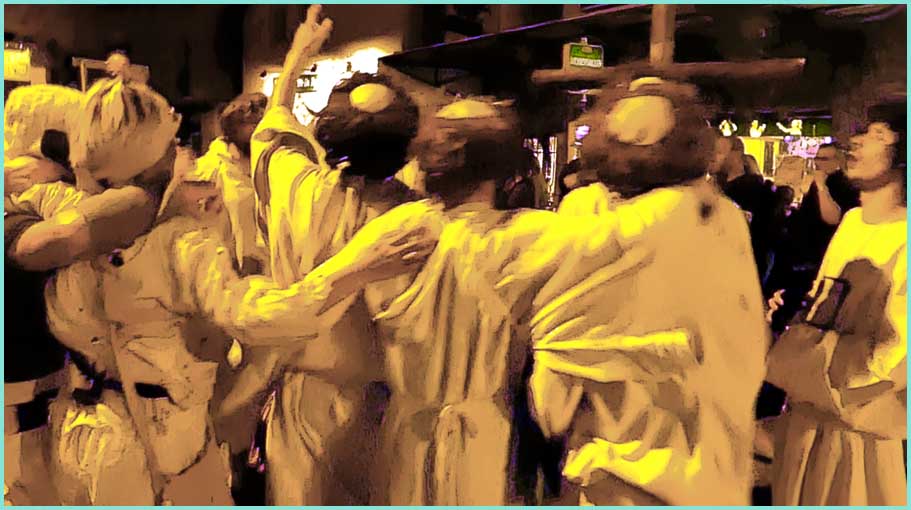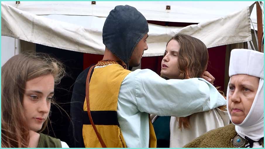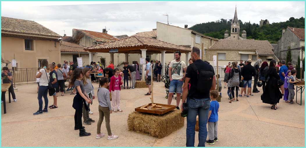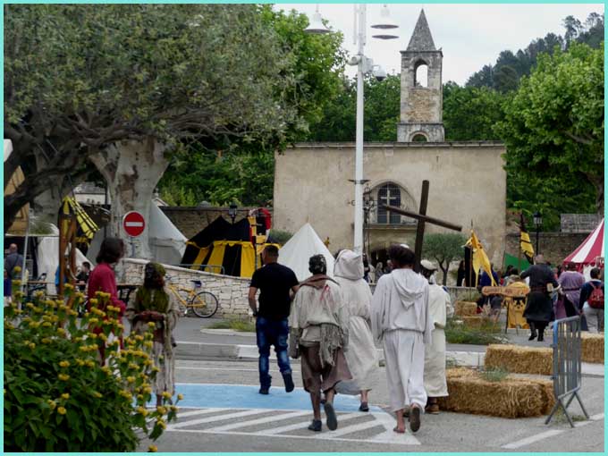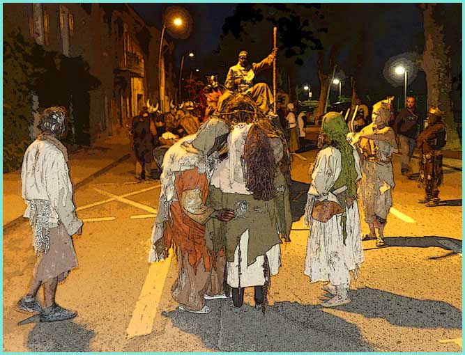 Une population hybride, vaguement moyenâgeuse, congestionne la place.