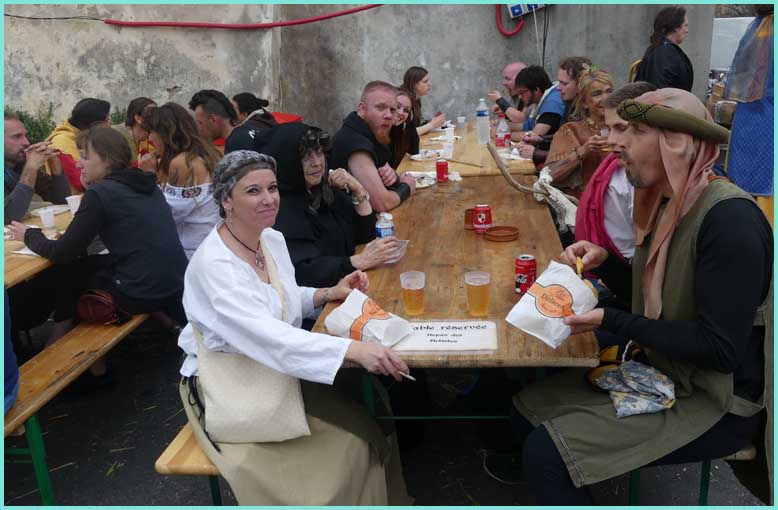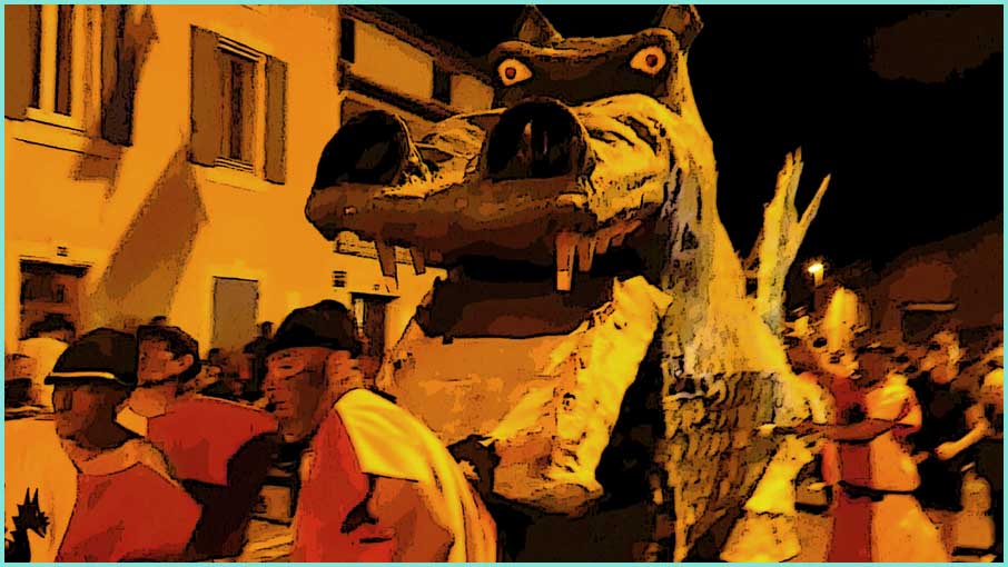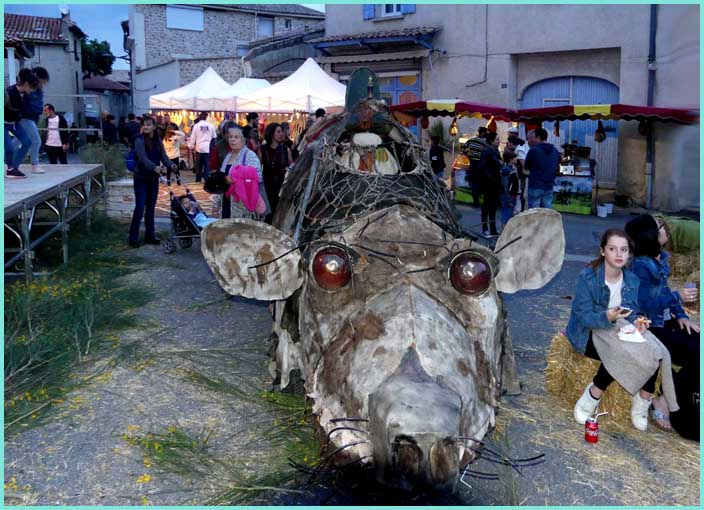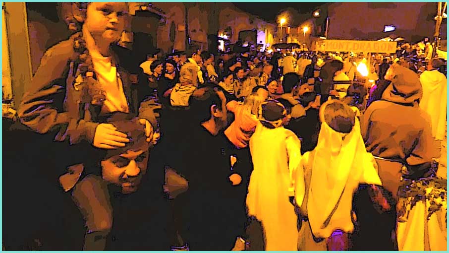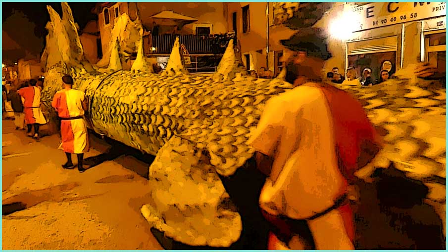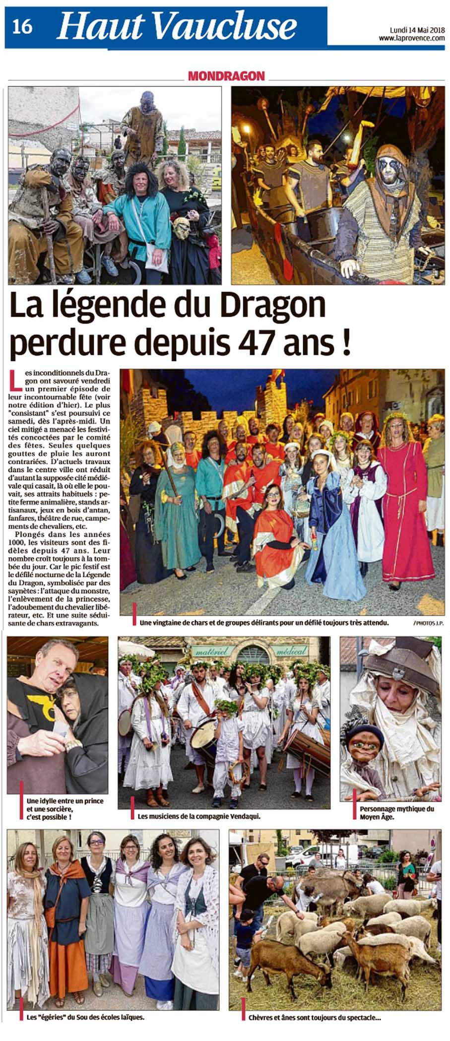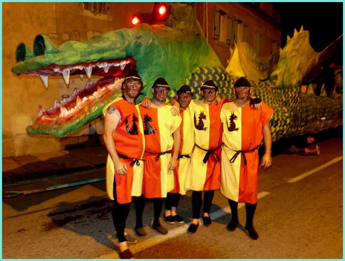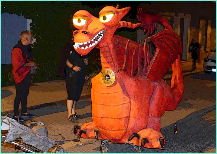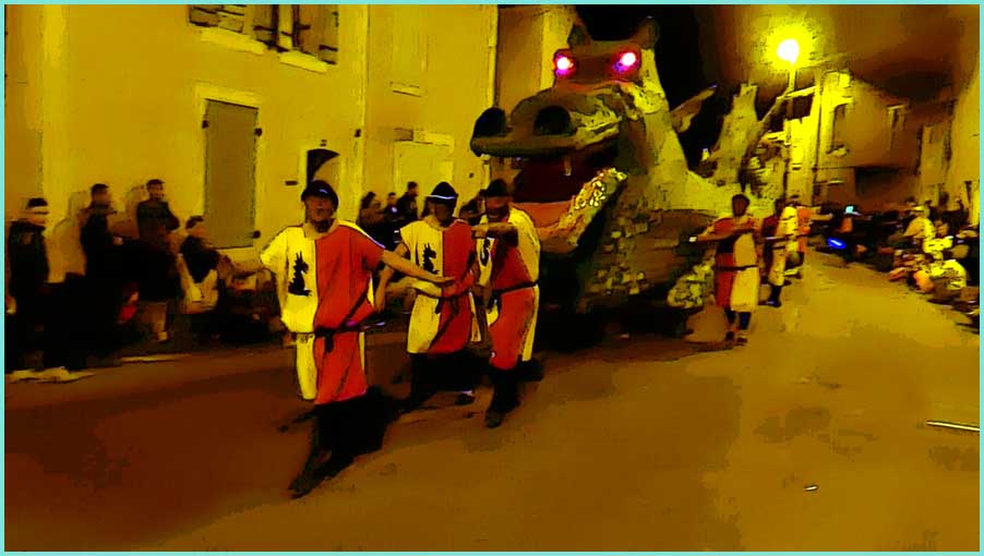 Vendredi soir, les inconditionnels du Dragon ont donc déjà savouré un premier épisode. Le plus consistant s’est poursuivi ce samedi, dès l’après-midi. Un ciel mitigé a menacé les festivités concoctées par le Comité des fêtes. Seules quelques gouttes de pluie les auront contrariées. Ouf ! D’actuels travaux dans le centre ville ont réduit d’autant la supposée cité médiévale qui casait, là où elle le pouvait, ses attraits habituels : petite ferme animalière, stands artisanaux, jeux en bois d’antan, fanfares, théâtre de rue, campements de chevaliers, etc. Plongés dans les années 1000, les visiteurs sont fidélisés depuis 47 ans. Leur nombre croît toujours à la tombée du jour. Car le pic festif porte sur le défilé nocturne de la Légende du Dragon, symbolisée par des saynètes : l’attaque du monstre, l’enlèvement de la princesse, l’adoubement du chevalier libérateur, etc. Un peu noyé dans l’ensemble, le synopsis émerge d’une suite séduisante de chars extravagants.   J. P.