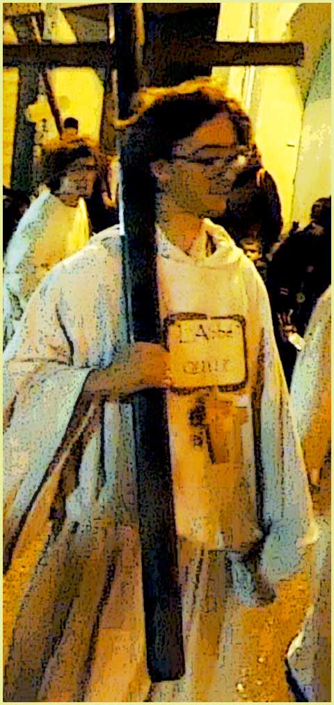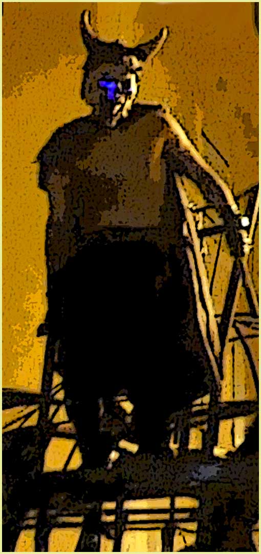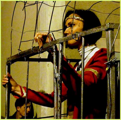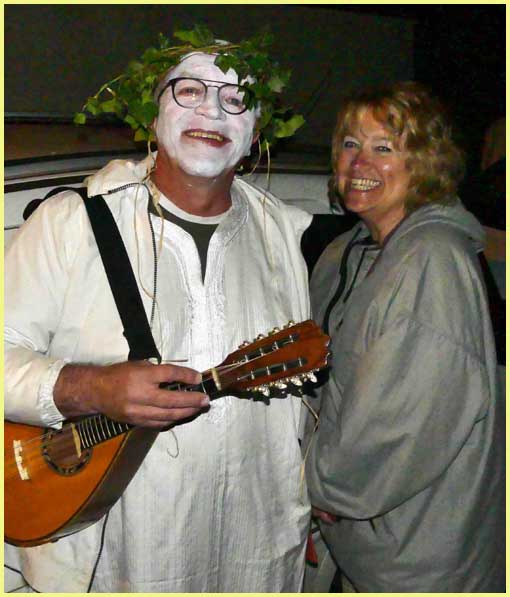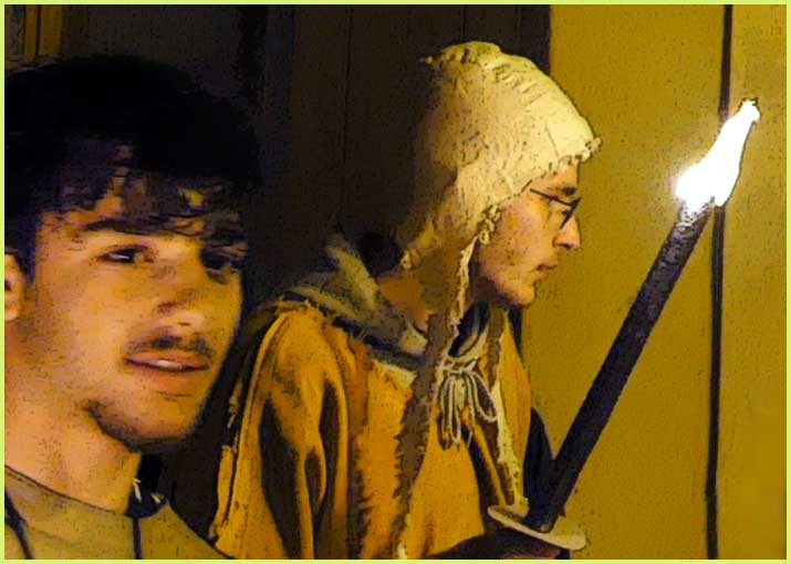 à proximité d'un panneau annonçant l'une des cinq saynètes, axées sur la Légende du Drac