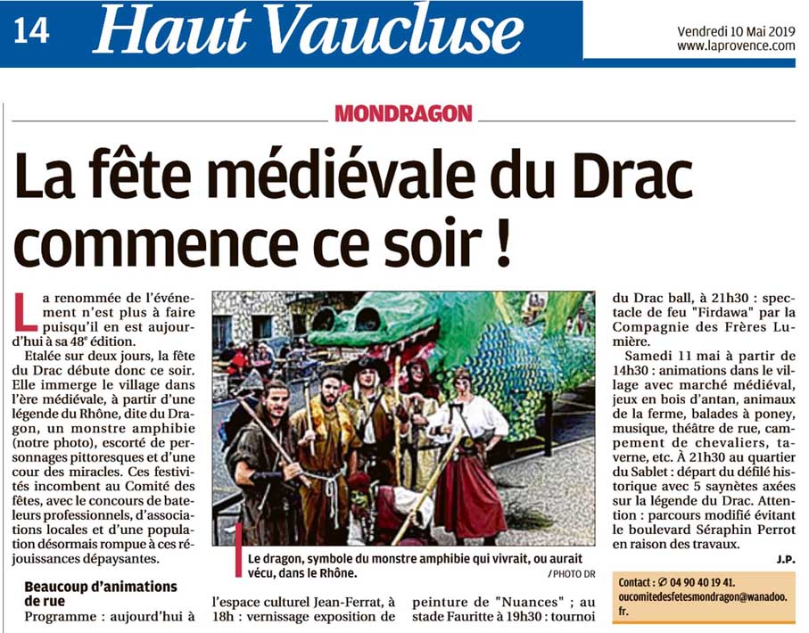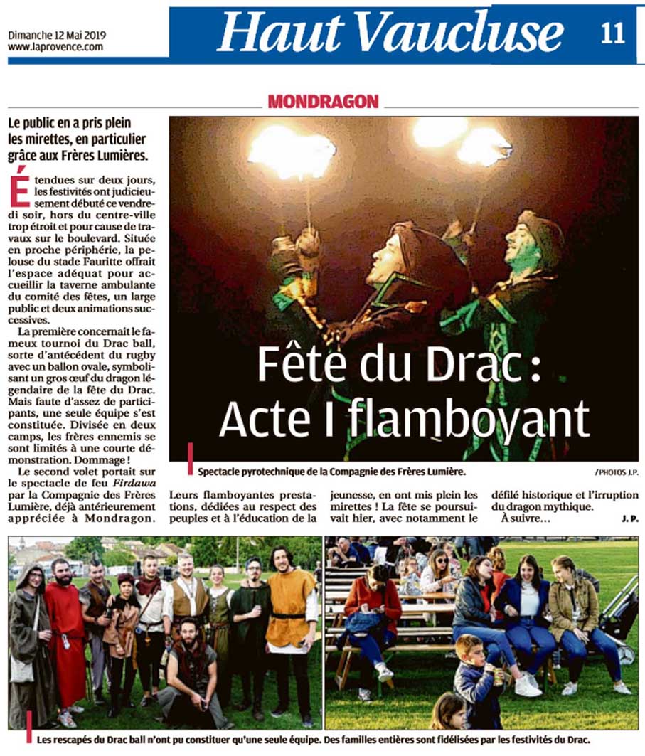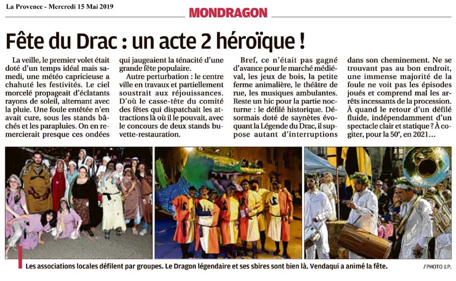 Reste un hic pour la partie nocturne : le défilé historique. Désormais doté de saynètes évoquant la Légende du Drac, il suppose autant d’interruptions dans son cheminement. Ne se trouvant pas au bon endroit, une immense majorité de la foule ne voit pas les épisodes joués et comprend mal les arrêts incessants de la procession. A quand le retour d’un défilé fluide et ininterrompu, indépendamment d’un spectacle clair et fixe ? A cogiter, à l’approche de la 50ème édition prévue en 2021 !     J. P.