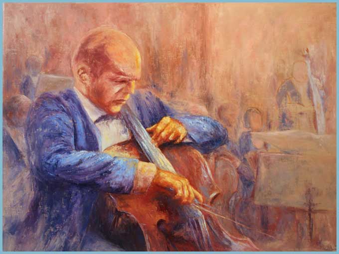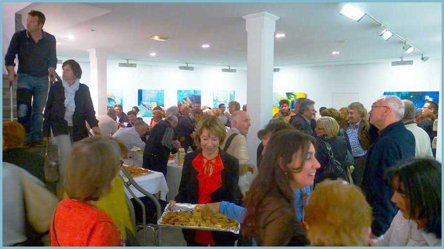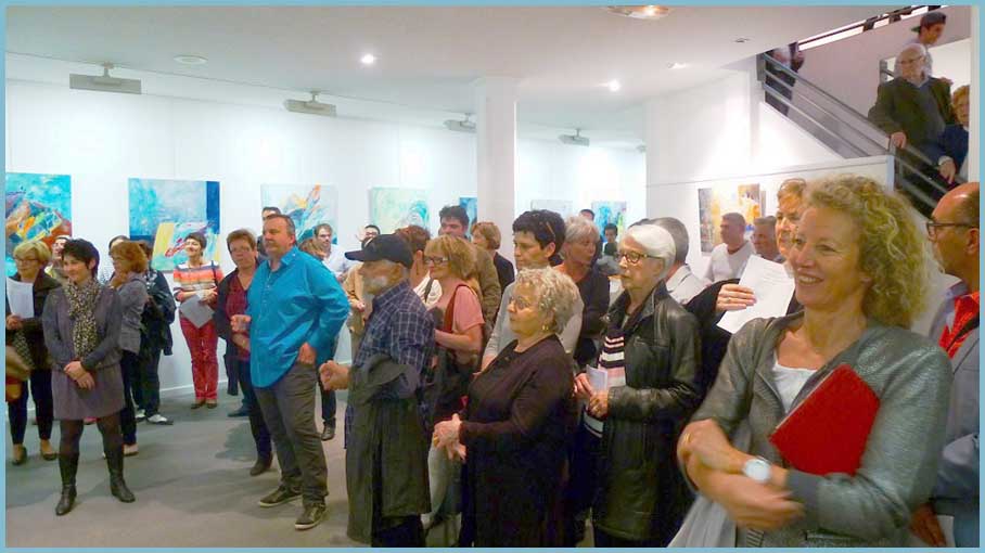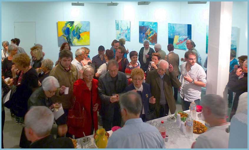 « Je pars du réel, un élément figuratif subsiste plus ou moins, puis je laisse aller l’imaginaire », explique-t-elle. Les couleurs vives et des compositions habiles jonglent avec un chat bleu, un poisson rouge, un midi au jardin, les vendanges, une contrebasse…Une quarantaine d’huiles pourvoit au merveilleux kaléidoscope !