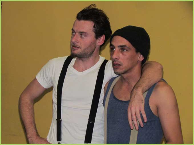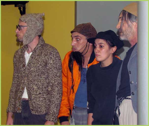 Cinq personnages burlesques (renforcés par quatre silhouettes muettes jouées par des amateurs) pourvoient à l’histoire de deux jeunes paumés, rejetés par le système, comme en fabriquent à foison les temps modernes.