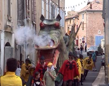 Un scénario plusieurs fois remanié (y compris par moi-même dans les années 80) tourne autour de "La Légende du Dragon". Un monstre (tantôt issu du Rhône, tantôt issu des rochers) et ses sbires s'emparent du village qu'il faut délivrer du mal. Deux clans s'opposent : les bons et les méchants. Les variantes vont à l'infini. Depuis quelques années, elles débutent par un marché médiéval, suivi du programme habituel : animation des rues, défilé costumé, clôture avec spectacle son et lumière. |