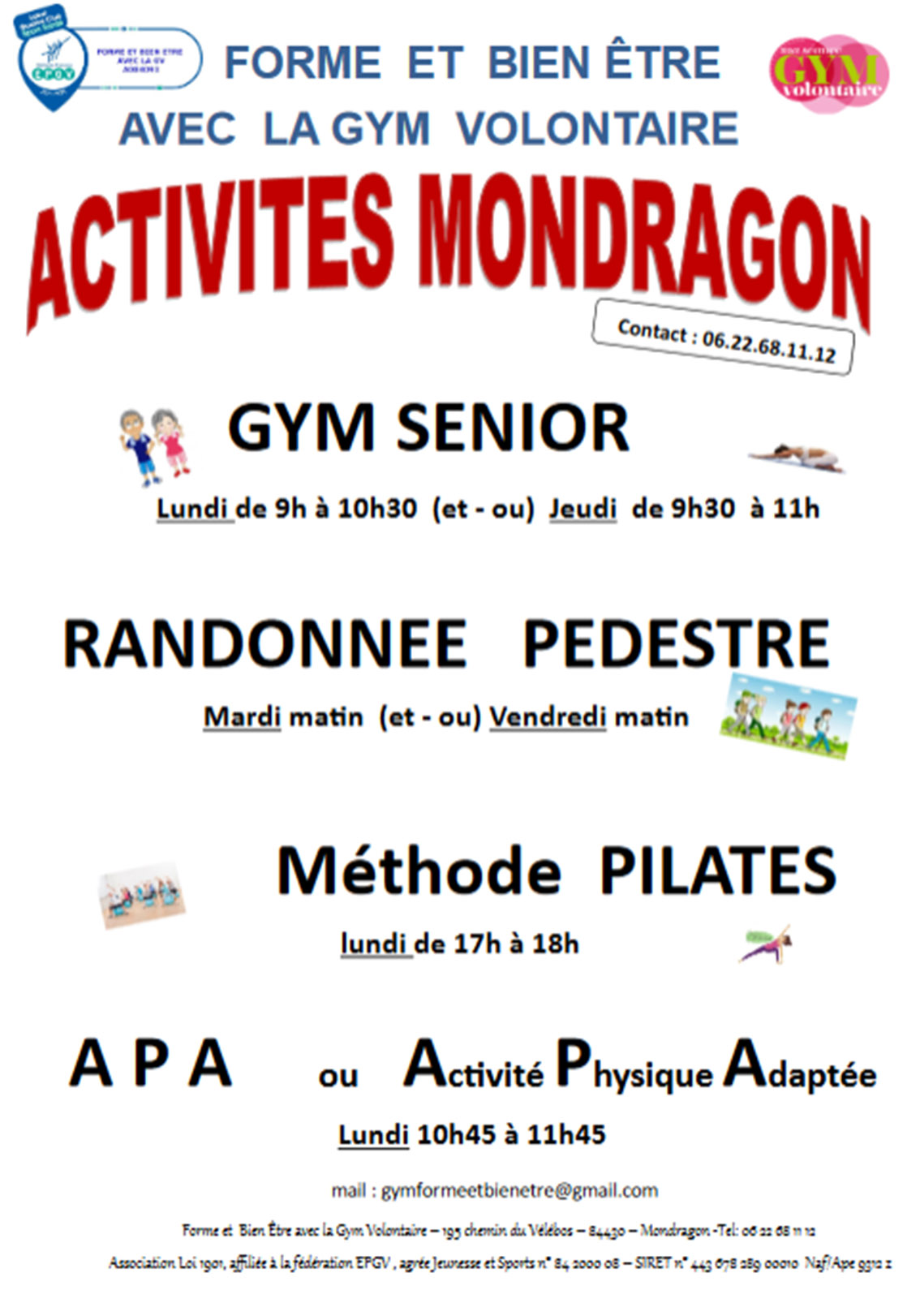 Le sport et la santé font toujours bon ménage. Axés sur cette évidence, bon nombre d'exemples animent efficacement la gent associative. A Mondragon, celui de l'association Forme et Bien-être avec la Gym Volontaire perdure depuis 26 ans. Apparus en 1998 autour de l'incandescente Dominique Bachelet, animatrice diplômée d'état, des cours adaptés ont profondément marqué des gymnastes de tous âges. La disparition de leur icône sportive en 2019, terrassée par la maladie, les a cruellement attristés. Mais la relève se préparait en 2017 avec l'élection du nouveau président Gérard Armérigo, succédant à Christian Bachelet, époux de Dominique, elle-même déjà relayée par de nouveaux animateurs, dont Bastien et Béatrice, actuellement en poste.