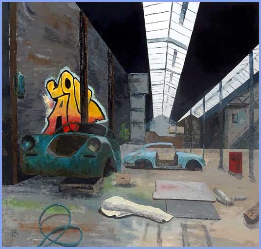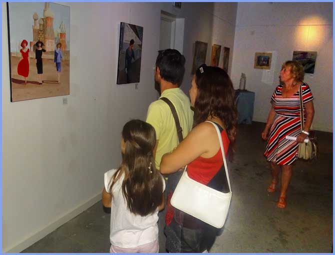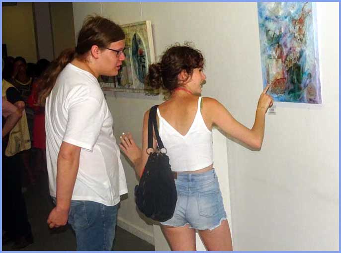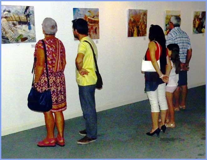 Deux autres membres de l’atelier CAP exposent aussi. Bruno Rodriguez peint depuis une dizaine d’années. Il travaille essentiellement à l’huile. Ses toiles sont l’expression de passions multiples : les voyages, les voitures, l’équitation. On passe indifféremment du Taj Mahal au Pont de Brooklyn, d’une rue passante à une boîte de nuit, du violoncelliste au cavalier, d’une Porsche 356 rutilante à une Golf en péril… Quelle diversité !
