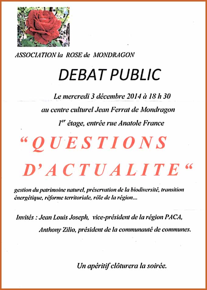 Dès 18h30, elle sera suivie d’un débat public sur des questions diverses d’actualité : gestion du patrimoine naturel, préservation de la biodiversité, transition énergétique, réforme territoriale, rôle de la Région, etc.