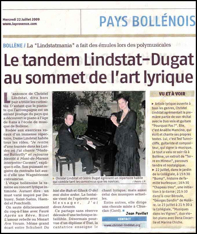de Bollène Le tandem Lindstat-Dugat au sommet de l’art lyrique La « Lindstatmania » continue de faire des émules à l’Hôtel Reynaud de la Gardette |