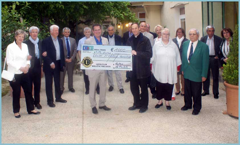 Parmi les donateurs, intervient aujourd’hui le Lions Club de Bollène Tricastin, siégé à l’hôtel restaurant « La Beaugravière », à Mondragon. Là même où, ce mardi soir, le président Pierre Michel, entouré d’une trentaine de membres, a remis un chèque de 1 000 € 7 M. le curé,de la paroisse de Bollène, satisfait par ce don généreux, susceptible de raccourcir d’autant l’arrêté de péril le privant de son église.