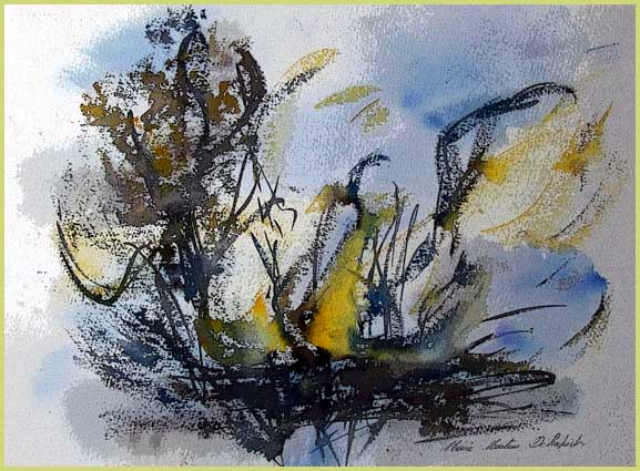 Les 26 œuvres exposées ne sont donc pas une esbroufe. « C’est du figuratif travaillé avec une tendance abstraite », hasarde l’exposante. Effectivement, la forme prévaut sur l’anecdotique où se déclinent, à l’aquarelle puis à l’huile : bords de mer, paysages exotiques ou simples parcelles de vécu en Bretagne, d’où est originaire son époux, qu’elle suit en Afrique pour y peindre lors de missions caritatives.