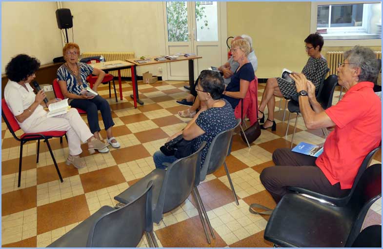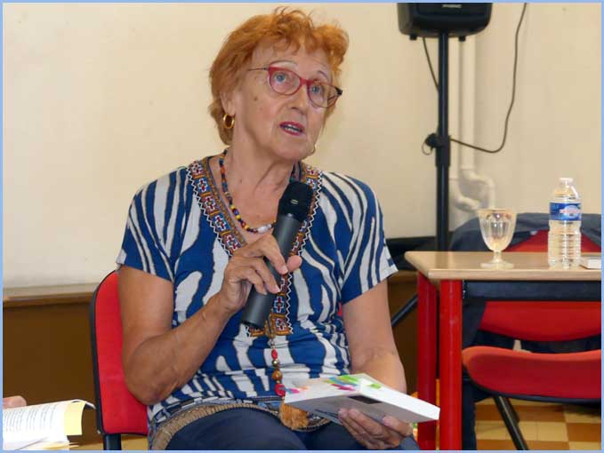 Evelyne Sanson, bibliothécaire, présente son invitée au public.