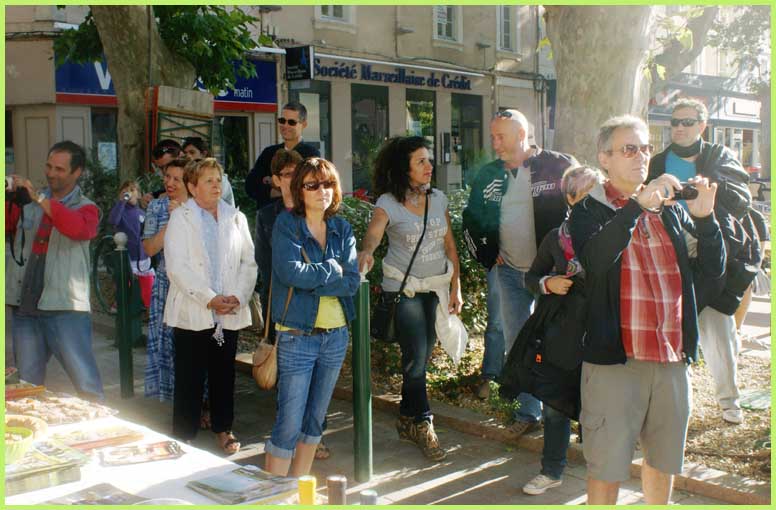 La vedette du jour est d’abord allée partager l’apéro, offert aux vacanciers par la Ville et servi par l’Office de tourisme. Claude Raoux, premier adjoint, a énuméré les multiples attraits qui caractérisent Bollène, devant un buffet substantiel, arrosé d’une dégustation de grands crus, offerte par le Domaine Julien de l’Embisque.