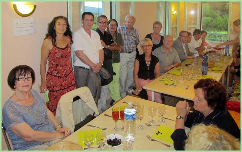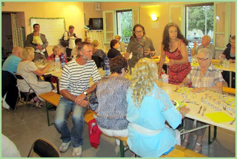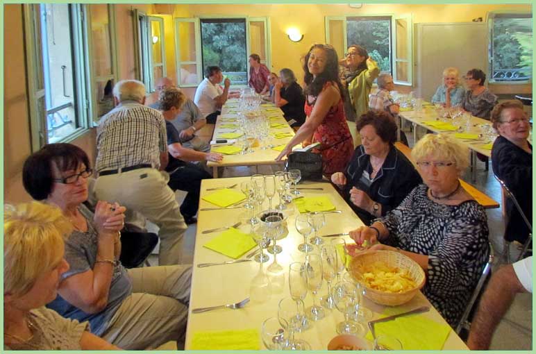 Sous le regard impassible d’un vol de cigognes, juché sur la haute tour de la collégiale Saint-Martin, une pluie fine mais persistante a obligé les 80 convives à se replier à l’intérieur de l’Oustau, où il a bien fallu les caser sur deux niveaux. Ce genre d’imprévu ne saurait décourager Marie-Claude Charpentier, présidente et hôtesse d’accueil hors pair, entourée d’une équipe bénévole diligente.