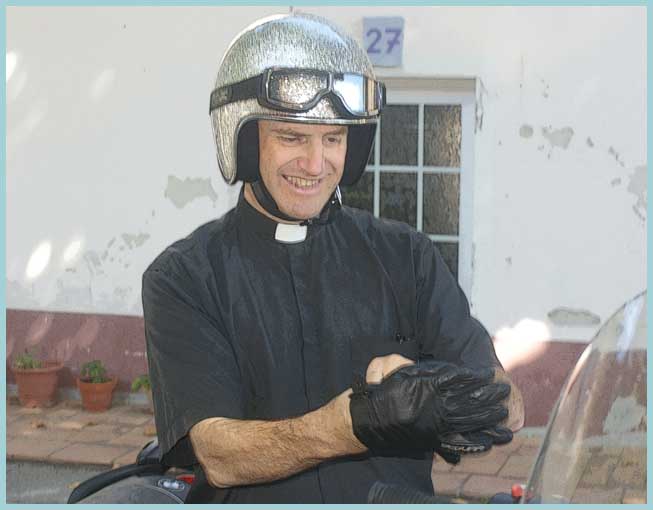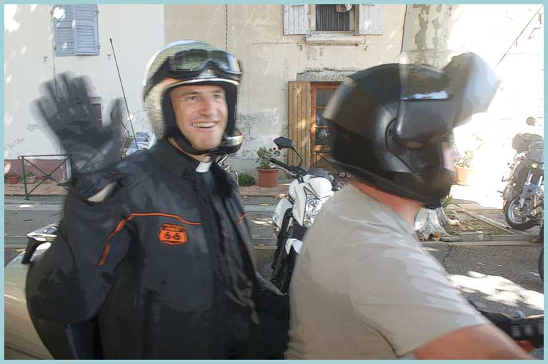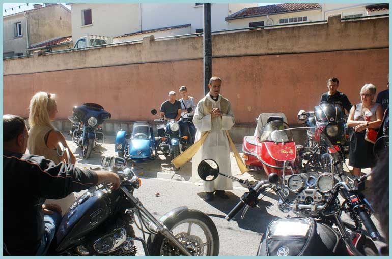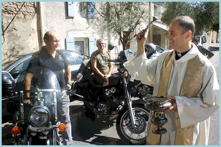 Entre temps, embarqué dans cet extraordinaire épisode festif qui barre temporairement l’accès du boulevard Jean-Jaurès, M. le curéa dûment revêtu sa robe blanche et béni la horde de motards, avant que l’un d’eux ne le coiffe d’un casque et ne le prenne comme passager pour un tour de ville pétaradant.