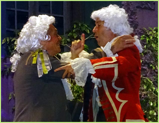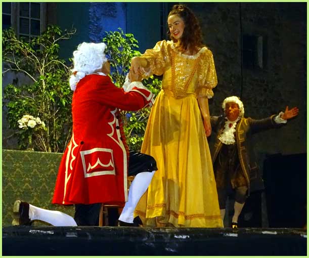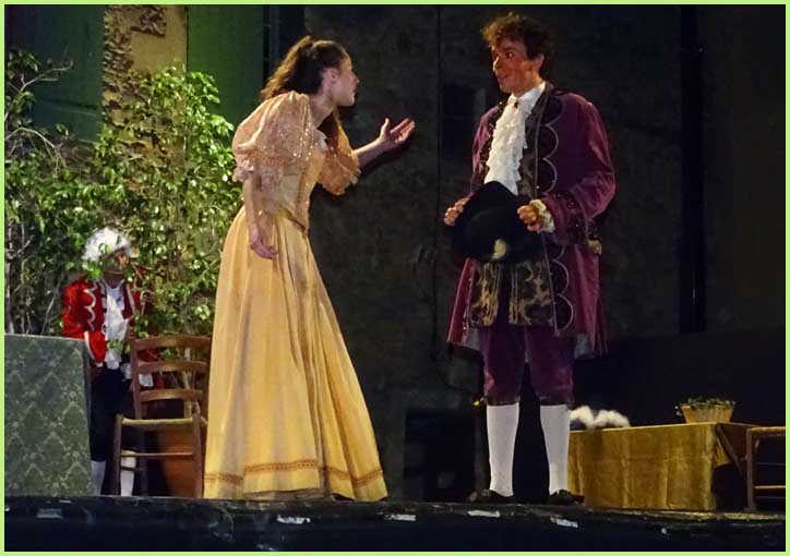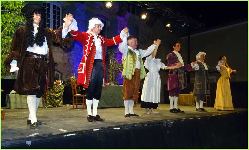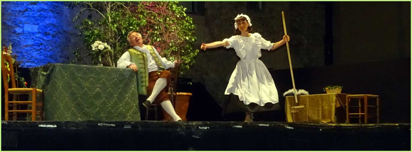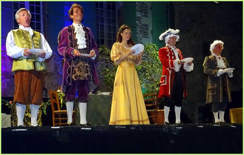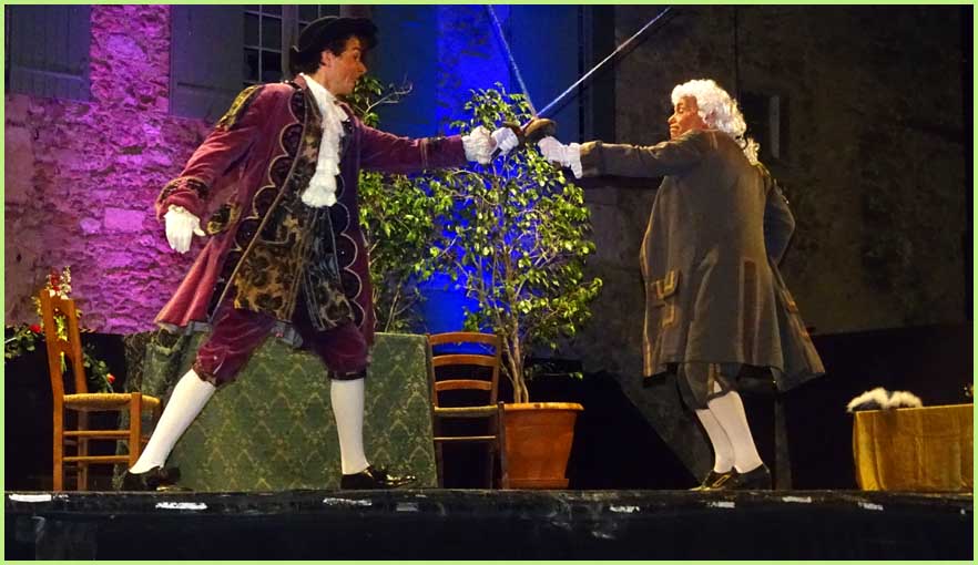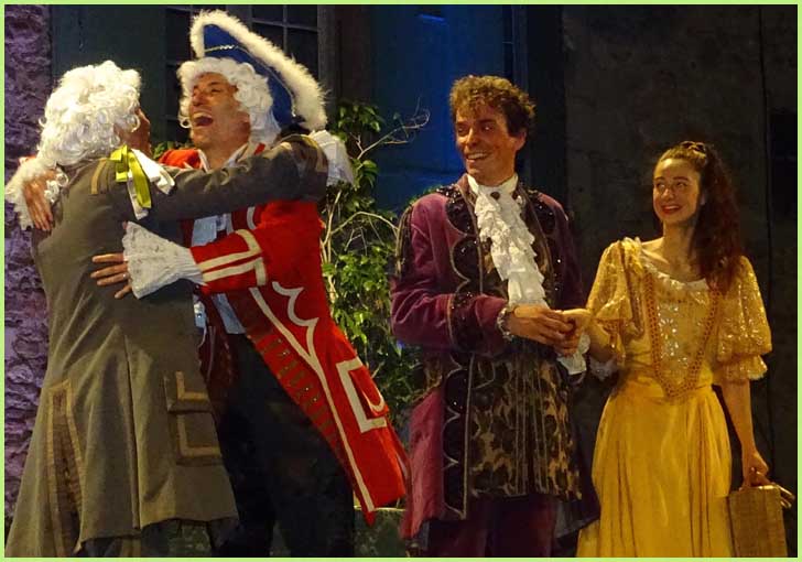 L’intrigue se prête à toutes sortes de pirouettes, au sens propre comme au figuré. Les dialogues sont entrecoupés de couplets chantés, de morceaux chorégraphiés, d’un duel à l’épée et de bris colériques de porcelaine. Avec une aisance d’autant plus surprenante que, comme nous l’ont révélé les artistes, ce spectacle répondait à une commande effectuée au dernier moment par la Ville, obligeant le Vers Galant à la monter illico pour Bollène !