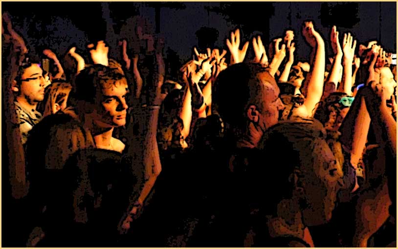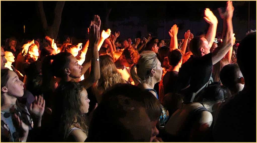 Devant le podium, pas de bancs alignés. A quoi serviraient-ils ? Debout, le magma humain est plus à l’aise pour trépigner, en osmose avec le spectacle survolté. Combinée avec des rayons lumineux, l’avalanche des décibels atteint les limites du supportable. C’est la loi du genre.