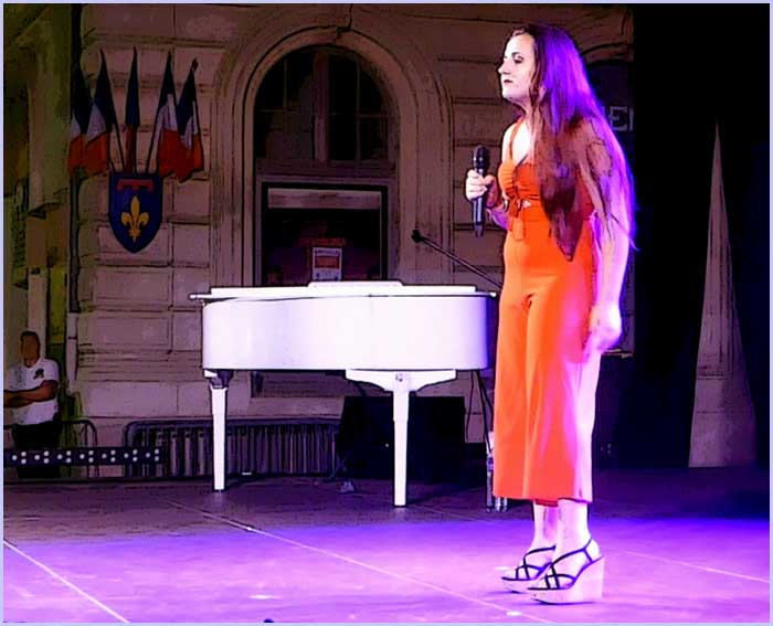 Au sortir de l’adolescence, vêtue de pourpre et la chevelure ondulante jusqu’à la taille, la chanteuse toujours en devenir use déjà de certains atouts. Calée sur le registre mezzo, sa voix lui autorise de beaux accents pour les mots tendres. Sa vocation artistique ne fait aucun doute. « Je chante depuis quatre ans, je continue de suivre régulièrement des cours de chant depuis 2016, je participe à des concours, j’anime des guinguettes et des restaurants, » argue-t-elle avec conviction.