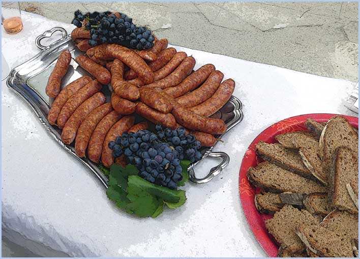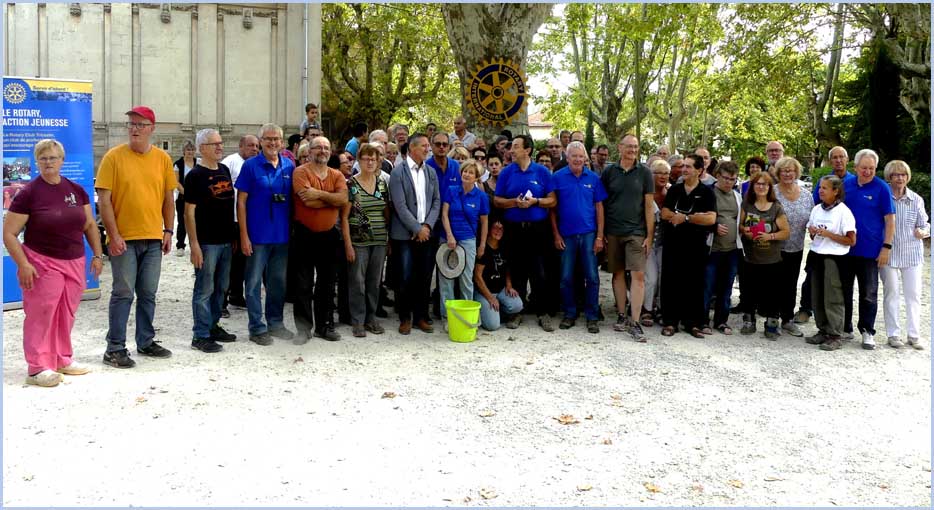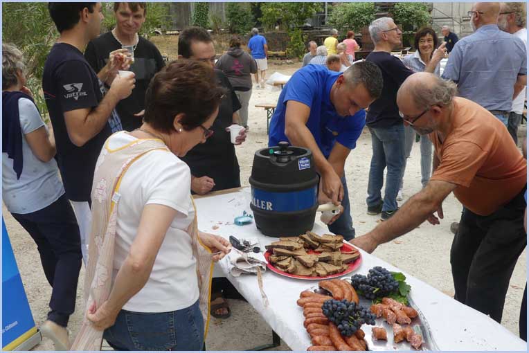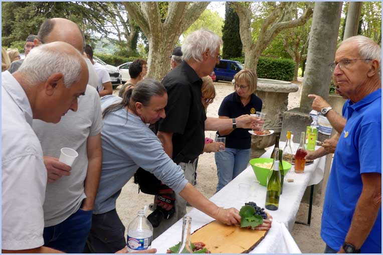 Une centaine de participants a joyeusement rallié l’événement avec des amis des Rotarys Clubs voisins et celui d’Hassfurt (Allemagne) dont treize de ses membres sont venus, chargés de victuailles (saucisses de Bavière et pains spéciaux). Etait aussi représentée la section pierrelatine de la Légion d’honneur. Vers midi, des tables alignées dans le parc ont réuni les convives, après une joyeuse matinée de vendange sur une proche parcelle du château.