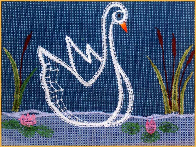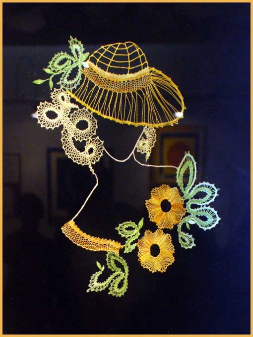 Divers types de travaux sont présentés : compositions figuratives (tableaux, décoration intérieure (sur nappes, coussins, etc.), décorations simples (sur coussins d’alliance, vêtements, etc.). Des panneaux explicatifs confrontent différentes origines en Europe du XVe au XIXe siècles : dentelles dites du torchon, de Cluny, de Flandres, de Bedfordshire, etc.
