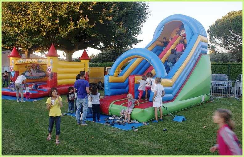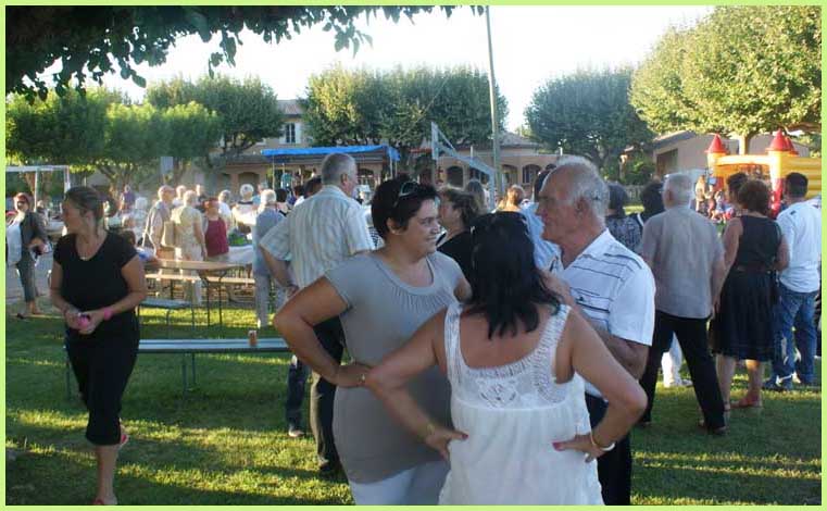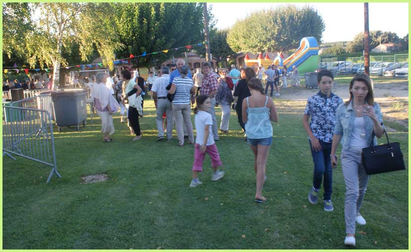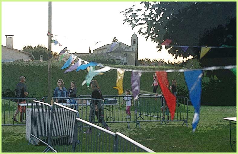 ![]() Par-dessus les fanions multicolores, au jour déclinant, depuis le clocher, Saint-Bénévolat veille toujours sur la fête.  |