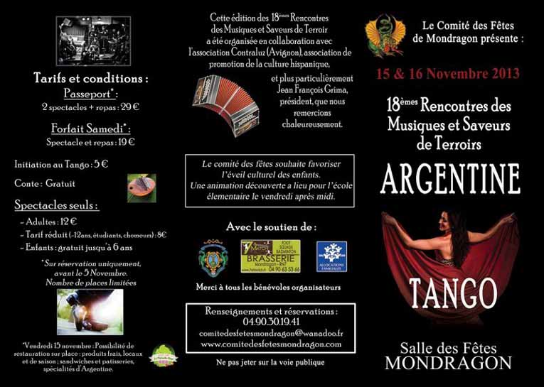 Cette mi-novembre sera celle du tango argentin avec la 18ème édition des Rencontres des Musiques et Saveurs de Terroirs, organisées par le Comité des fêtes de Mondragon, en collaboration avec l’association Contraluz (Avignon), axée sur la promotion de la culture hispanique.