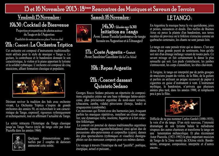 • 21h : concert par « La Orchestra Triptica » avec cinq musiciens à mi-chemin entre les répertoires classique et populaire. Démonstration de tango par deux couples spécialistes.