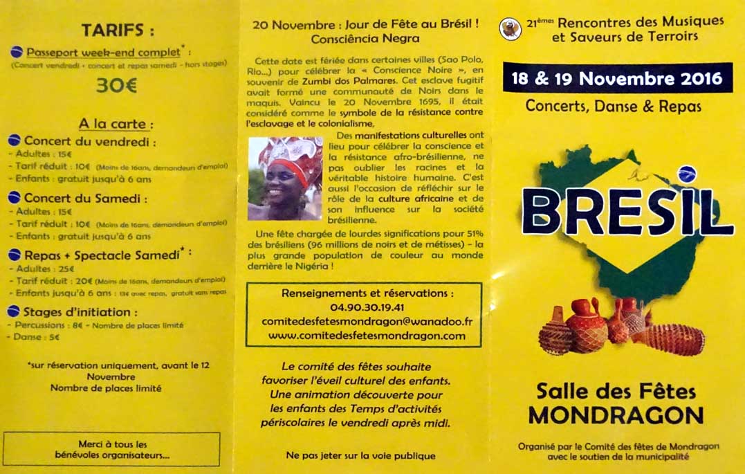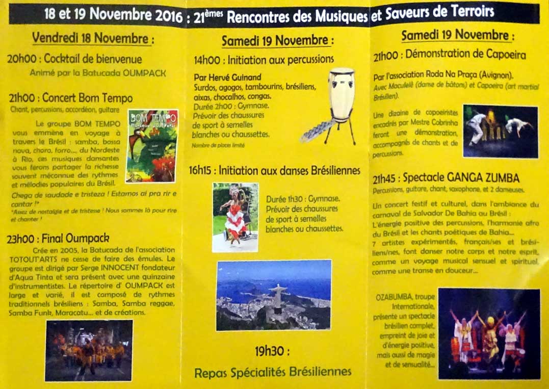 - à 16h15 : initiation aux danses brésiliennes par Hervé Guinand (prévoir chaussures de sport à semelles blanches ou chaussettes)