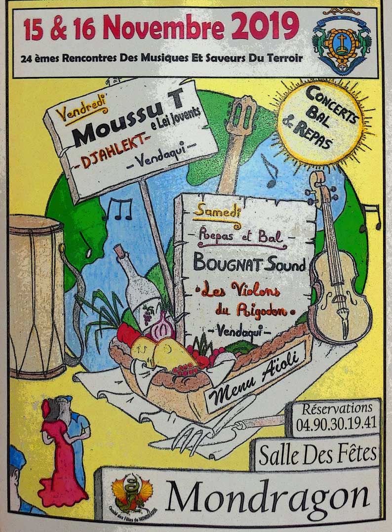 Vendredi 15 novembre, à partir de 19h30 : apéro animé par Vendaqui, suivi par le groupe « Moussu T e Lei Jovents », un quintette vocal et instrumental axé sur l’opérette marseillaise, enrichie par des rythmes du monde. Le groupe Djahlekt proposera ensuite un voyage festif de musiques du monde.