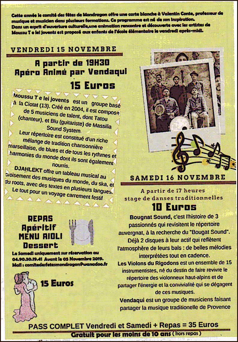 Samedi 16 novembre, à partir de 17h : stage de danses traditionnelles (10 €)  puis concert par le trio Bougnat Sound qui revisite le répertoire auvergnat. Suivront les Violons du Rigodon, un ensemble de 15 musiciens qui ressuscite le répertoire des violoneux haut-alpins. Un menu apéro-aïoli-dessert (15 €) est proposé sur réservations. Pass complet (deux jours + repas) = 35 €. Contact : 04.90.30.19.41.