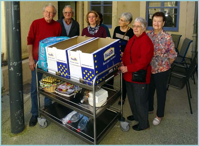 L’action caritative du Sou de Poche porte en effet sur une dizaine de visites par an auprès des 85 résidants, coïncidant (à peu près) avec Noël, les Rois, Pâques, le fête des mères, etc. Or, aux liens affectueux, s’ajoutent quelques cadeaux (eau de Cologne, brumisateur ou autres) et, surtout, un goûter constitué de pâtisseries.