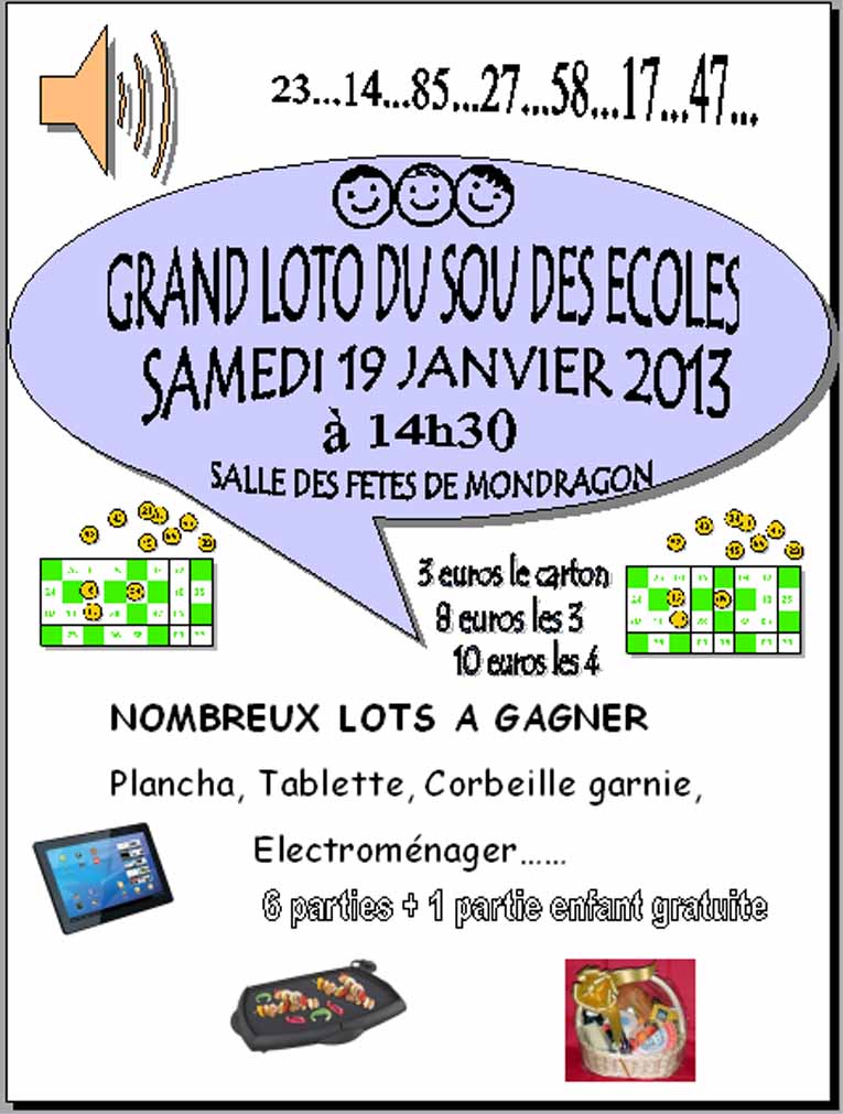 En décembre dernier, le Sou des écoles laïques de Mondragon offrait un spectacle aux enfants du groupe scolaire Jean-Moulin à la salle des fêtes. Là même où il propose à la population son loto annuel, samedi 19 janvier à 14h30. De nombreux lots sont à gagner (un carton 3 €, trois cartons 8 €, quatre cartons 10 €).