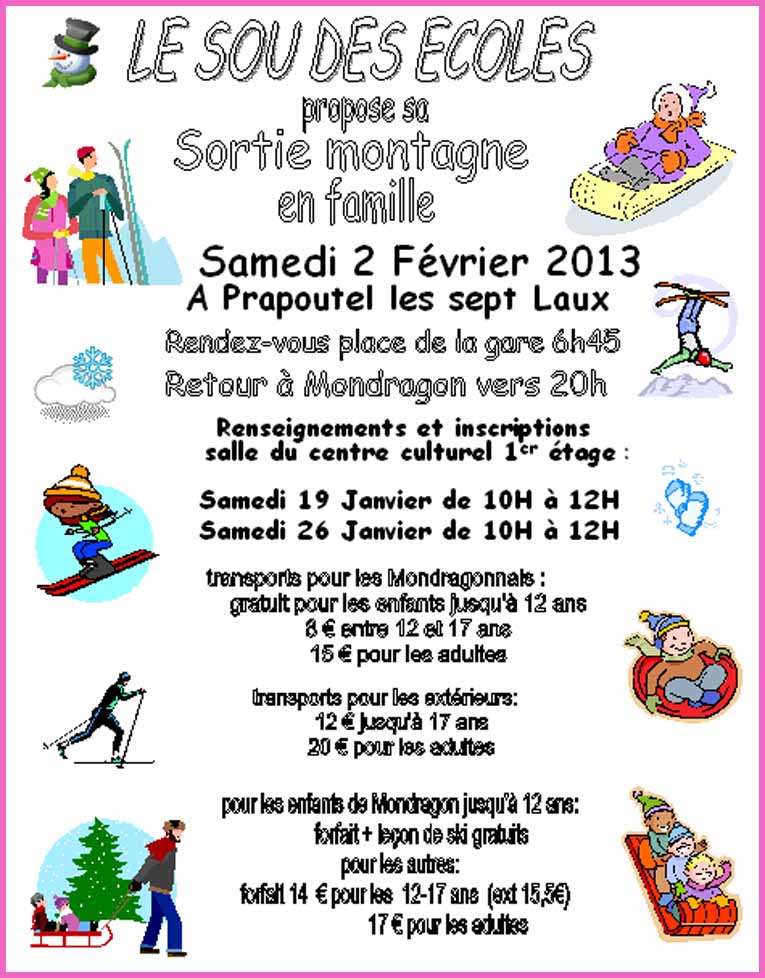 Et voici l’incontournable sortie à la montagne en famille, programmée le samedi 2 février à Prapoutel les Sept Laux. Point de ralliement et départ à 6h45 place de La Gare. Retour à Mondragon vers 20h.