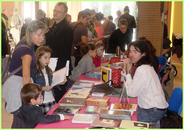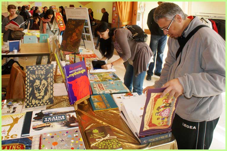 Trois auteurs-illustrateurs y ont animé des ateliers, avant de venir dédicacer leurs ouvrages au salon. Les librairies L’Orange bleue et Mobilivres restent fidèles à l’événement. Divers stands créatifs, dont celui du « Paint-Bike » (peinture aléatoire), tournent à plein régime. Une exposition de dessins couvre les murs.