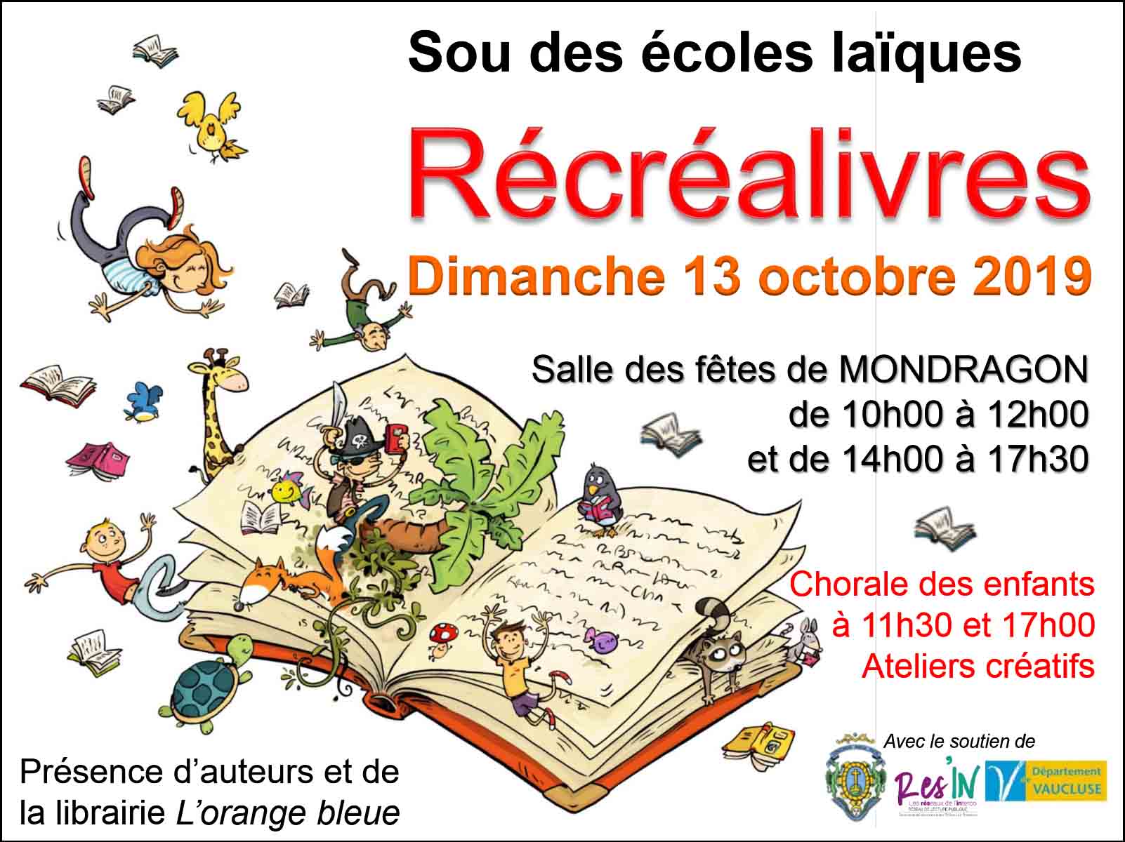 Les membres du Sou des écoles laïques de Mondragon organisent leur 16ème édition du Salon du livre pour la jeunesse : Récréalivres. Ils rappellent que leur association, à but non lucratif, regroupe des parents d’élèves et des enseignants, sympathisants de la cause laïque. Ces bénévoles donnent de leur temps et de leur énergie pour des événements de deux types : ceux qui visent à promouvoir la culture et l’égalité pour tous avec des activités gratuites, et ceux qui permettent de récolter des fonds directement profitables aux enfants des classes maternelles et élémentaires. Ces fonds subventionnent une partie des projets proposés chaque année (spectacle de fin d’année, cadeaux de Noël pour la maternelle, sorties et matériel pédagogique pour toutes les classes).