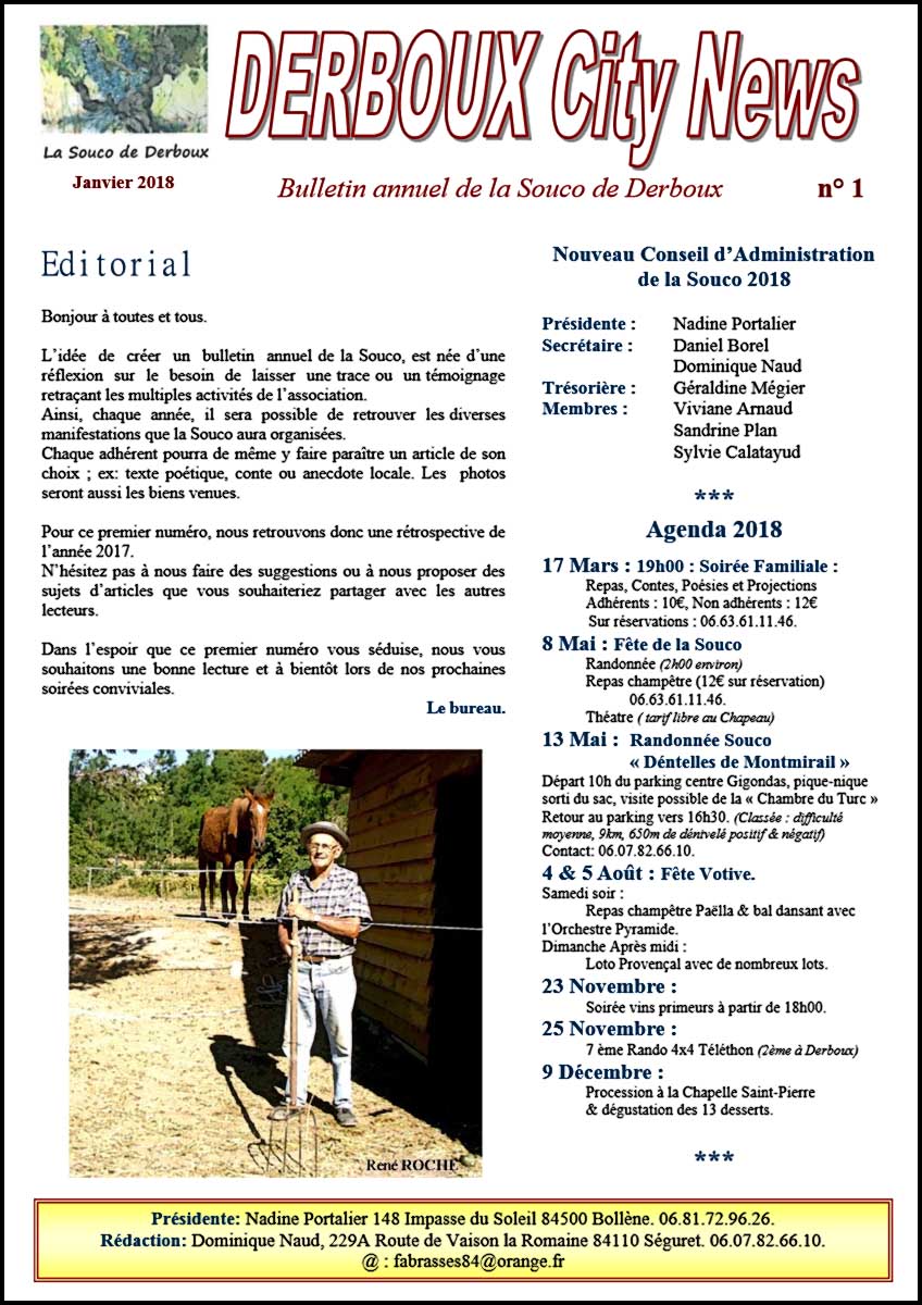 Le bulletin annuel « Derboux City New » vient d’être créé dans le but de retracer les nombreuses activités de l’association. Le n° 1 comporte une rétrospective de l’année 2017. Des suggestions et propositions d’articles sont les bienvenus.