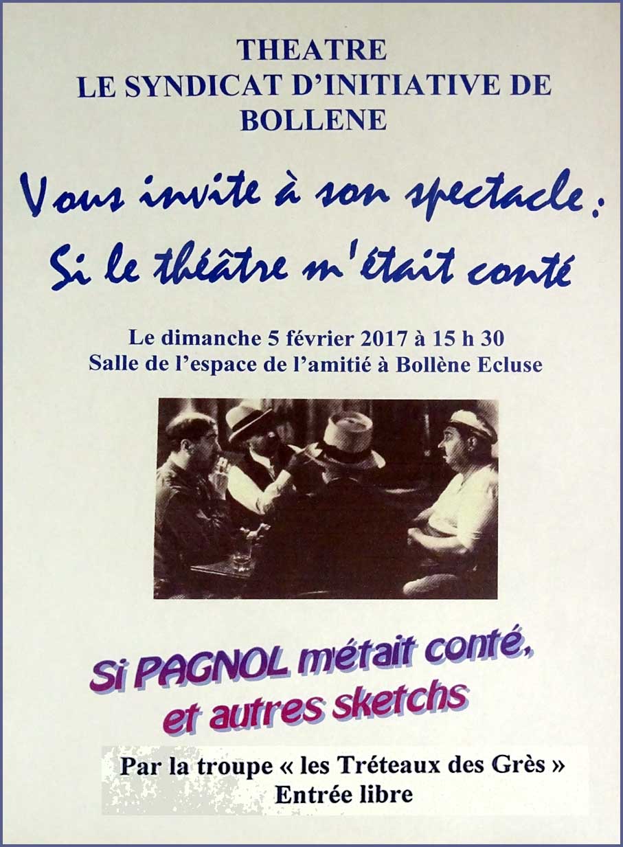 Cela fait partie du programme d’animations, organisé chaque année par le Syndicat d’initiative. Après le récent concours de vitrines, et avant la reprise des visites guidées en ville, des randonnées pédestres autour de Bollène, la brocante Lez Bouquins et le concert annuel de la chorale du Delta dirigée par Coline Serreau (à Mondragon), voici donc le spectacle proposé par les Tréteaux des Grès : « Si le théâtre m’était conté ».