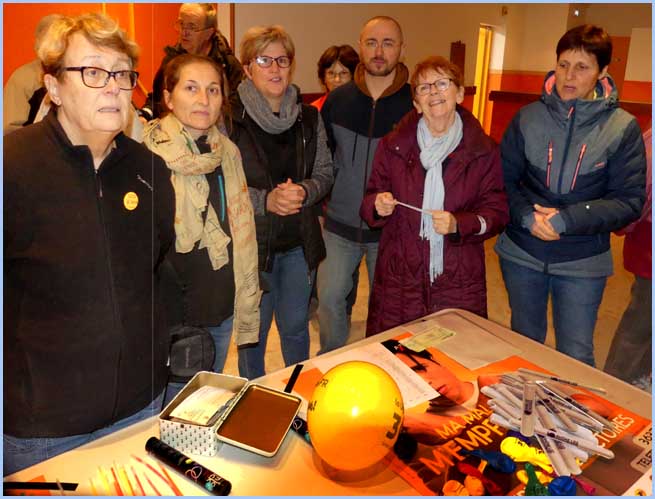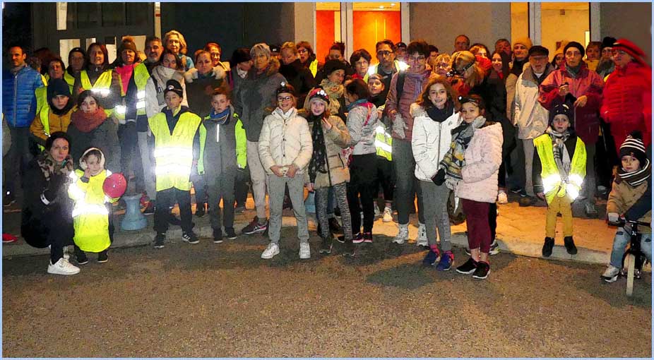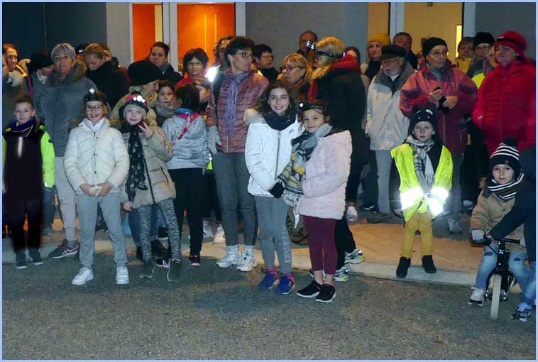 Vendredi soir, une bonne centaine de citadins a répondu à l’appel du foyer rural des jeunes pour crapahuter dans les rues du village et sur sa proche périphérie côté plaine. Une halte réconfortante, avec vin chaud ou jus fruit, était proposée à l’esplanade du Levant par les jeunes gens de l’Accueil loisirs. Le circuit en boucle s’est terminé au point de départ, à la salle des fêtes, avec un quart des participants en moins, soit 75 convives qui se sont régalés d’une carbonade de bœuf, suivie d’éventuels jeux de société. Ce samedi matin, une séance chorégraphique de zumba jaune complétait ce programme. Le tout moyennant une obole à chaque étape au profit du Téléthon.    J. P.