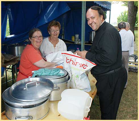 De gauche à droite : visite des élus (parapluie), stand Secours Catholique, Marinette Serres, Thérèse Dugloud, le père Eloy (jeux), le père Lelièvre (buvette)...