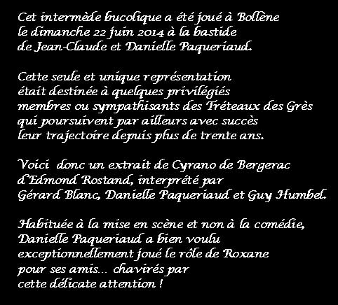 ![]() Les Tréteaux préparent leur saison 2014 -2015. Non, vous redis-je, rien qui n'aille puiser chez Edmond Rostand... |
