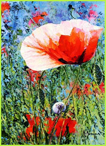 de soleil, les coquelicots, chardons et ombelles remplissent le cadre.