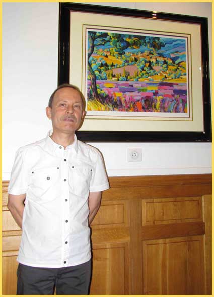 C’est une première pour Bollène qui accueille enfin Zanella, peintre et coloriste établi à Vaison-la-Romaine, et dont les gammes flamboyantes n’en finissent plus de séduire les amateurs du genre, en France et dans le monde. Subjugués, les fans tombent en pâmoison. Car la formule fonctionne à fond et se décline à l’infini : accord majeur bleu-jaune-rouge auréolé de quelques variantes, compositions habiles à l’emporte-pièce, géométries simplifiées et volutes ostentatoires qui, indifféremment, embrasent la Provence, Venise, l’Amérique, la Grèce, les châteaux de la Loire ou des bouquets.