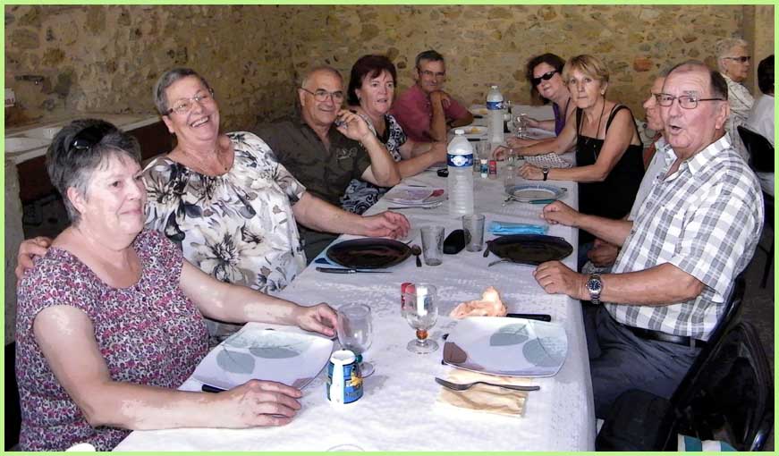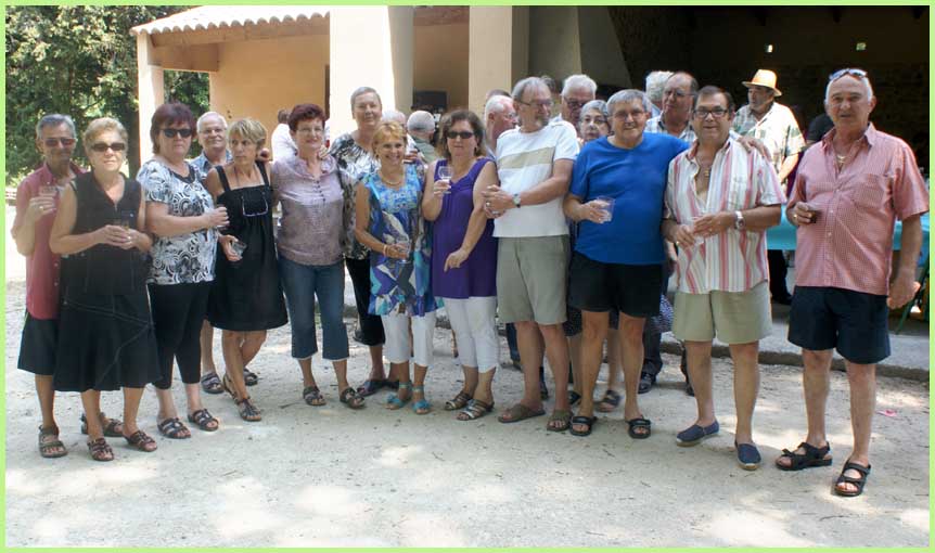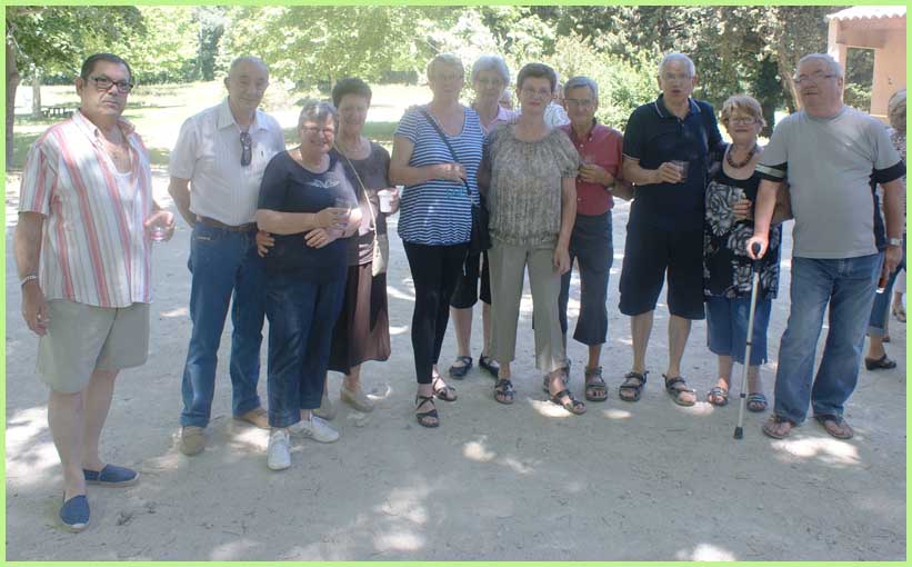Re-belote (au propre et au figuré car on joue effectivement aux cartes) en cette mi-juillet : second pique-nique au même endroit avec plus de 80 couverts. A l’apéro, couverte de fleurs, Monique Joly prétendait fêter ses 70 ans. Or, elle en paraît guère plus que la moitié avec son sourire juvénile ! Un concours de boules a été remporté par Jean-Claude Boyer et Louis Catrice.
