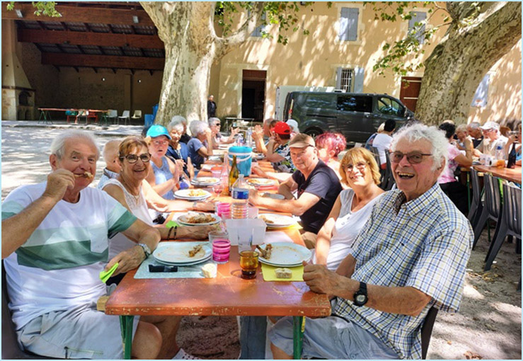 Les vacances, la canicule et certainement les JO ont influé sur le nombre de convives de ce jeudi 8 août. Habituellement, ils sont toujours près d'une centaine de convives contre une petite cinquanteine, réunie sous les frais ombrages de la ferme de l'Ile vieille. Au menu : melon-jambon cru, poulet basquaise (excellent), fromage et vacherin (traiteur de l'Atelier des Gourmets). Prochain repas : la traditionnelle paëlla le jeudi 5 septembre.