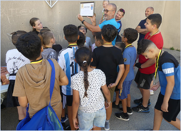 Une distribution de diplômes, en présence des parents, vient de récompenser les enfants de l'école de boxe éducative bollénoise. Selon le plan de formation en vigueur, les grades successifs sont évalués par 9 couleurs de gants : blanc niveau 1, jaune niveau 2, orangé niveau 3, rouge niveau 4, etc. Ces distinctions confirment l'assiduité des jeunes adeptes disciplinés, dont les mieux formés se sont qualifiés, en ce début d'année, au championnat départemental pour le championnat régional.