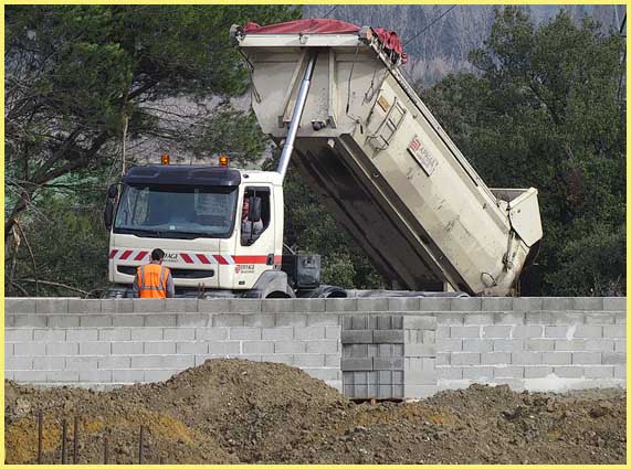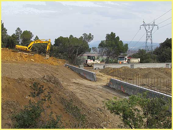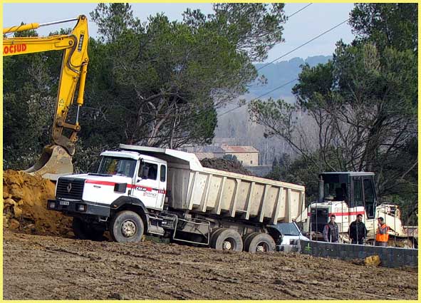 | Le chantier domine la vallée (en arrière-plan). La terre est acheminée par un roulement de camions. |