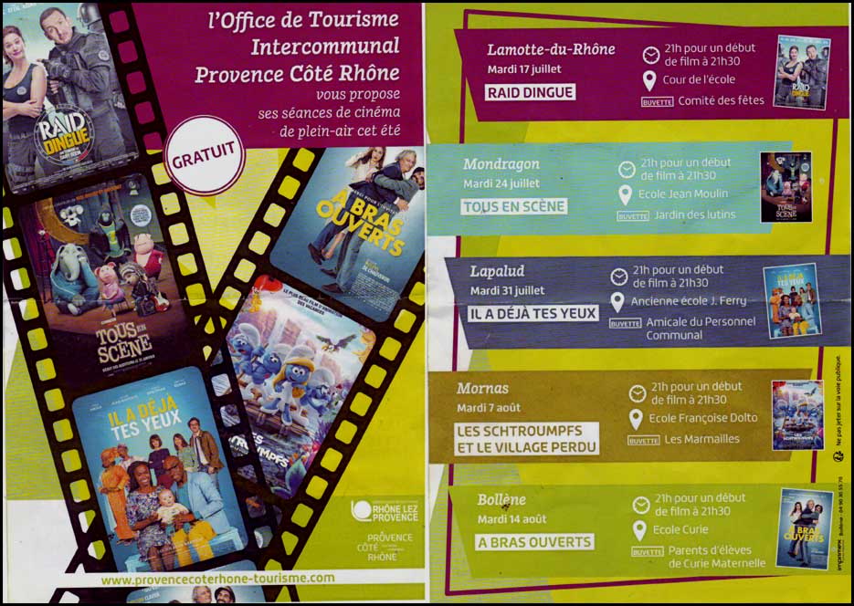 Créées l’été dernier par l’Office de tourisme intercommunal, ces séances de cinéma gratuites en plein air constituent un formidable lien social. Elles se poursuivent cette année avec succès. Les cinq communes concernées en profitent avec la collaboration d’une association locale qui accueille le public et tient une buvette. La tournée a débuté à Lamotte-du-Rhône dans la cour de l’école avec le Comité des fêtes, puis à Mondragon à l’école Jean-Moulin avec le Jardin des Lutins. Toujours à 21h30, elles se poursuivront à Lapalud mardi 31 juillet à l’ancienne école Jules-Ferry avec l’Amicale du personnel communal, puis à Mornas mardi 7 août à l’école Françoise-Dolto avec Les Marmailles, et se clôtureront à Bollène mardi 14 août à l’école Curie avec l’association des parents d’élèves de la maternelle.