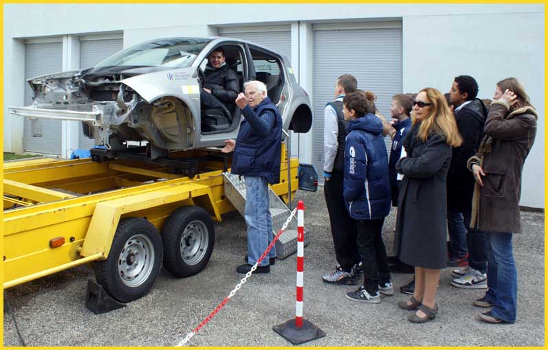 Prenant le relais, Odile Huet, principale du collège, nous a escortés en personne pour la visite des ateliers : tests de choc, simulation d’accident, « voiture tonneau », exercices de premiers secours et d’évacuation, attitude responsable lors de transports en car, etc.
