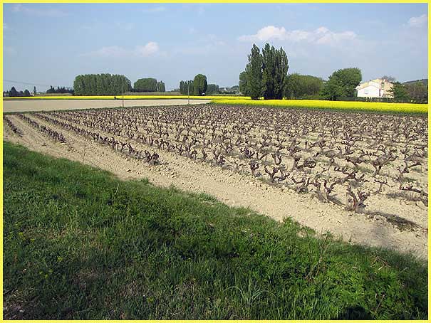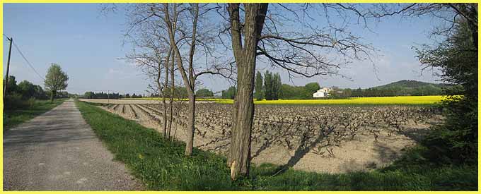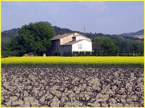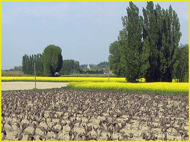 Y a la vigne qui fait grise mine (premier plan) , tandis que le colza exulte. Y a une abeille qui butine (au centre) et moi qui ne sais plus où donner de l'objectif... |