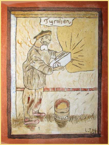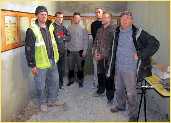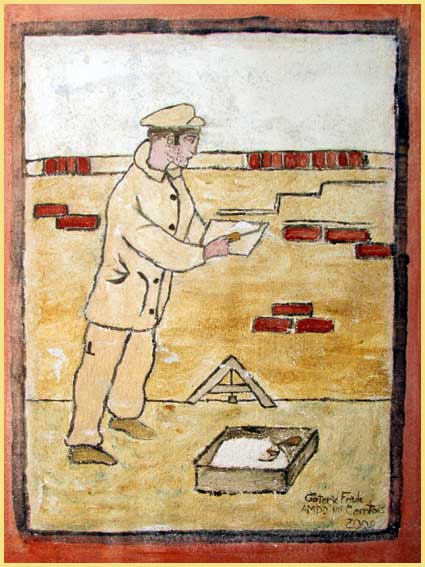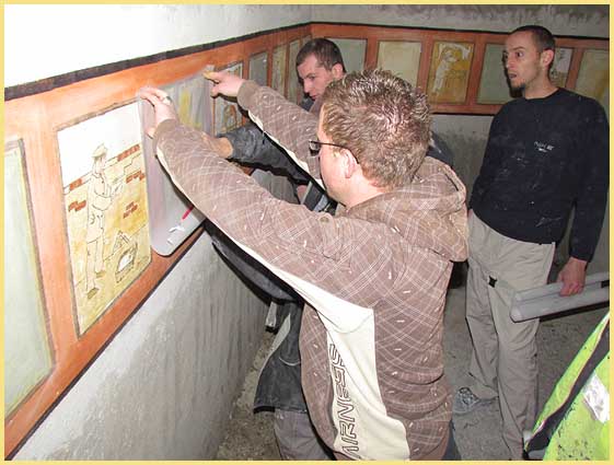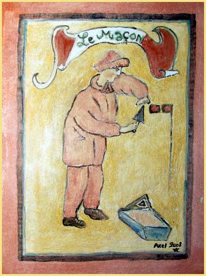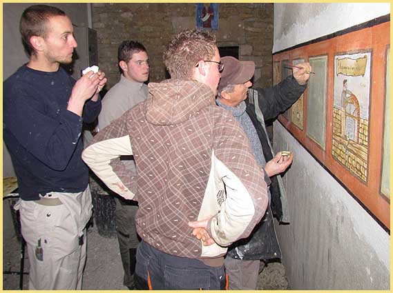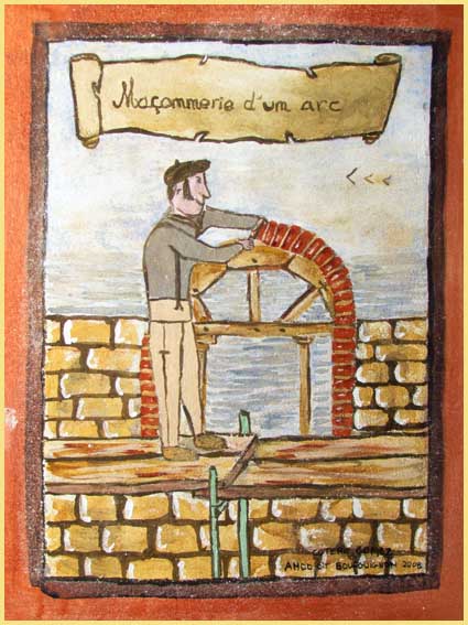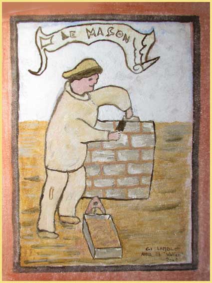 A partir d’un calque transféré sur le mur fraîchement crépi, chaque motif représente un compagnon à l’œuvre selon les différentes phases de travail du maçon. Le résultat est surprenant. L'ensemble constitue une BD juvénile, d’une exquise fraîcheur !