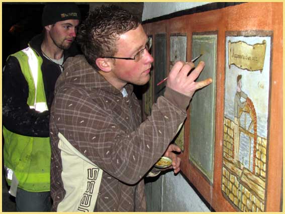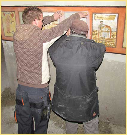 A partir d’un calque, chaque motif est transféré puis peint sur le mur fraîchement crépi.